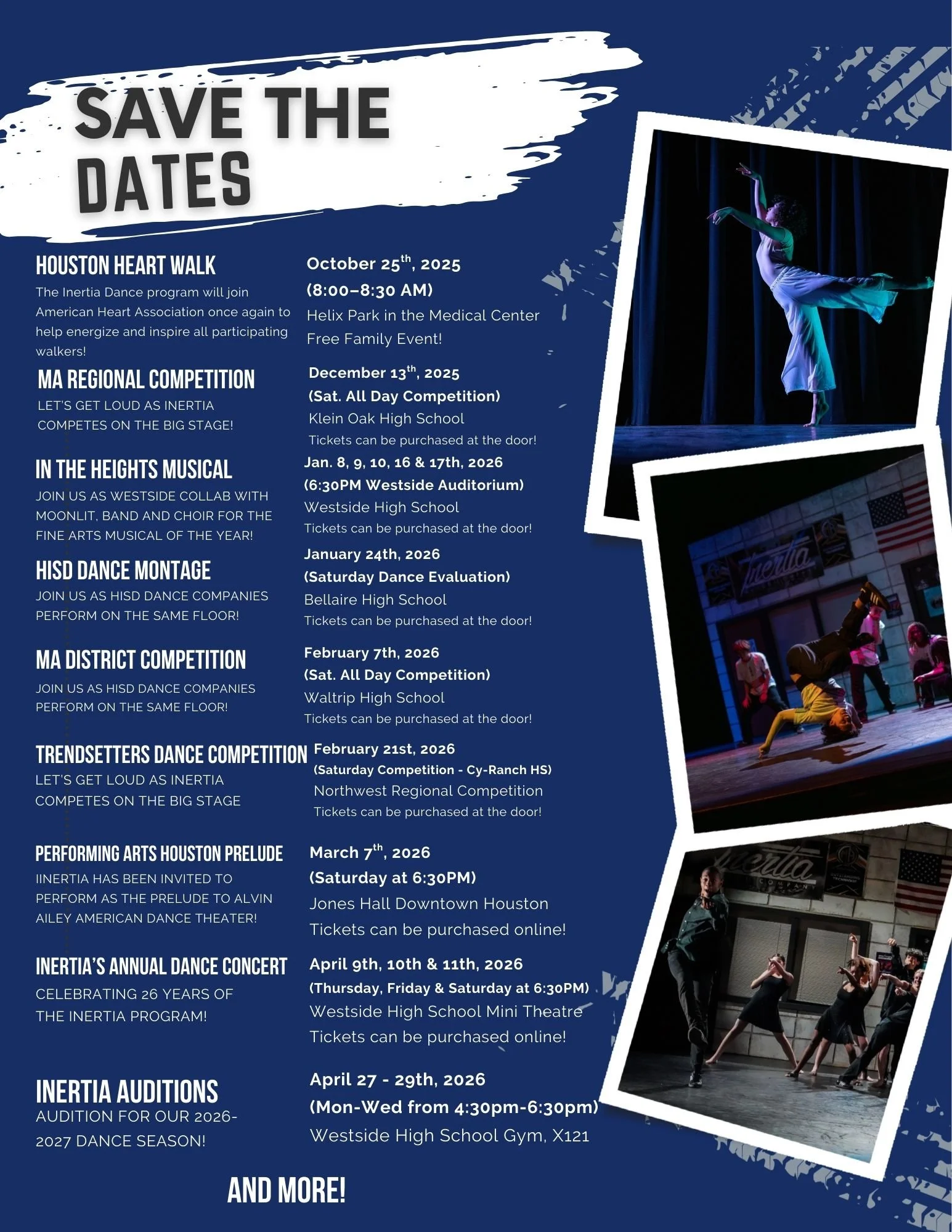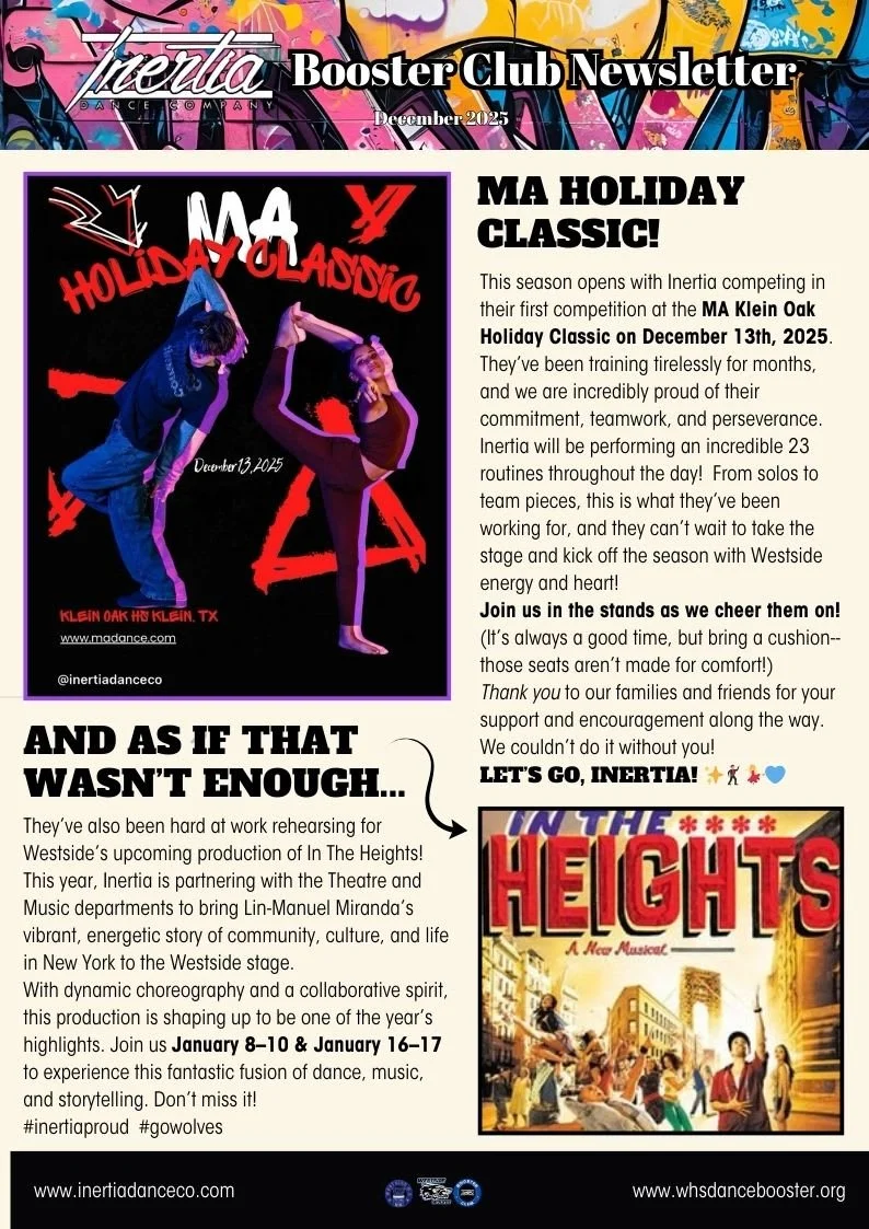 The Inertia Dance Company of Westside High School in the Houston Independent School District, is conducting its annual Sponsorship drive. We are happy to give businesses the opportunity to participate in benefiting the outstanding student dancers of INERTIA. By becoming an INERTIA sponsor, you will enable our dancers to perform in regional and national dance competitions, to travel, to share in dance festivals and conventions; you will defray production expenses, such as lighting, costuming, and sound. And you will have the chance to help a student reach their goals. INERTIA Dance Company operates under the guidelines and requirements of the Texas Education Agency, and is a public school organization, therefore contributions are tax-deductible.